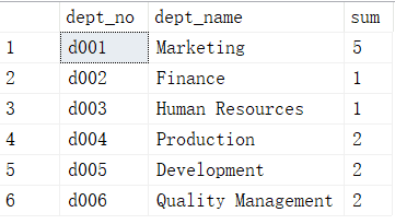 统计各个部门的工资记录数,给出部门编码dept_no、部门名称dept_name以及部门在salaries表里面有多少条记录sum