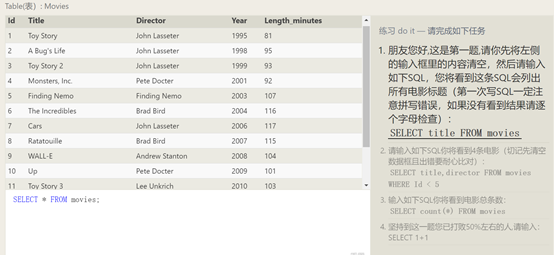 如果说SQLZOO的英文网站阅读体验不太友好的话,可以用XUESQL,这个网站是一个全中文版,有相应的任务练习,还有配套的B站教程,非常适合练习。