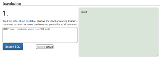 原数据已经给出,根据题目的要求进行相应检索,如SQLZOO,左边是题目,右边是练习输出,可以切换成中文版,不过切换以后是繁体。