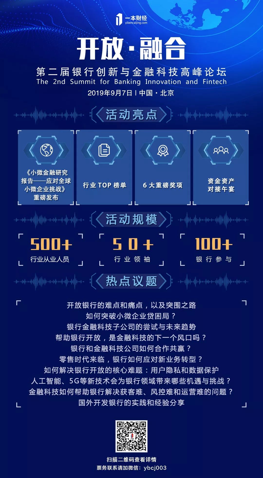 9月7日,一本财经将于北京举办“开放·融合”第二届银行创新与金融科技高峰论坛。
