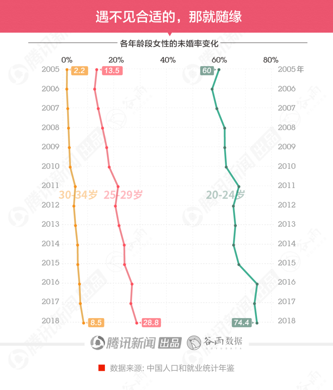 人口与就业统计年鉴公布的数据来看,各个年龄段的女性未婚率均呈上升趋势。其中,25-29岁年龄段的女性未婚率从2005年的13.5%上升到2018年的28.8%。