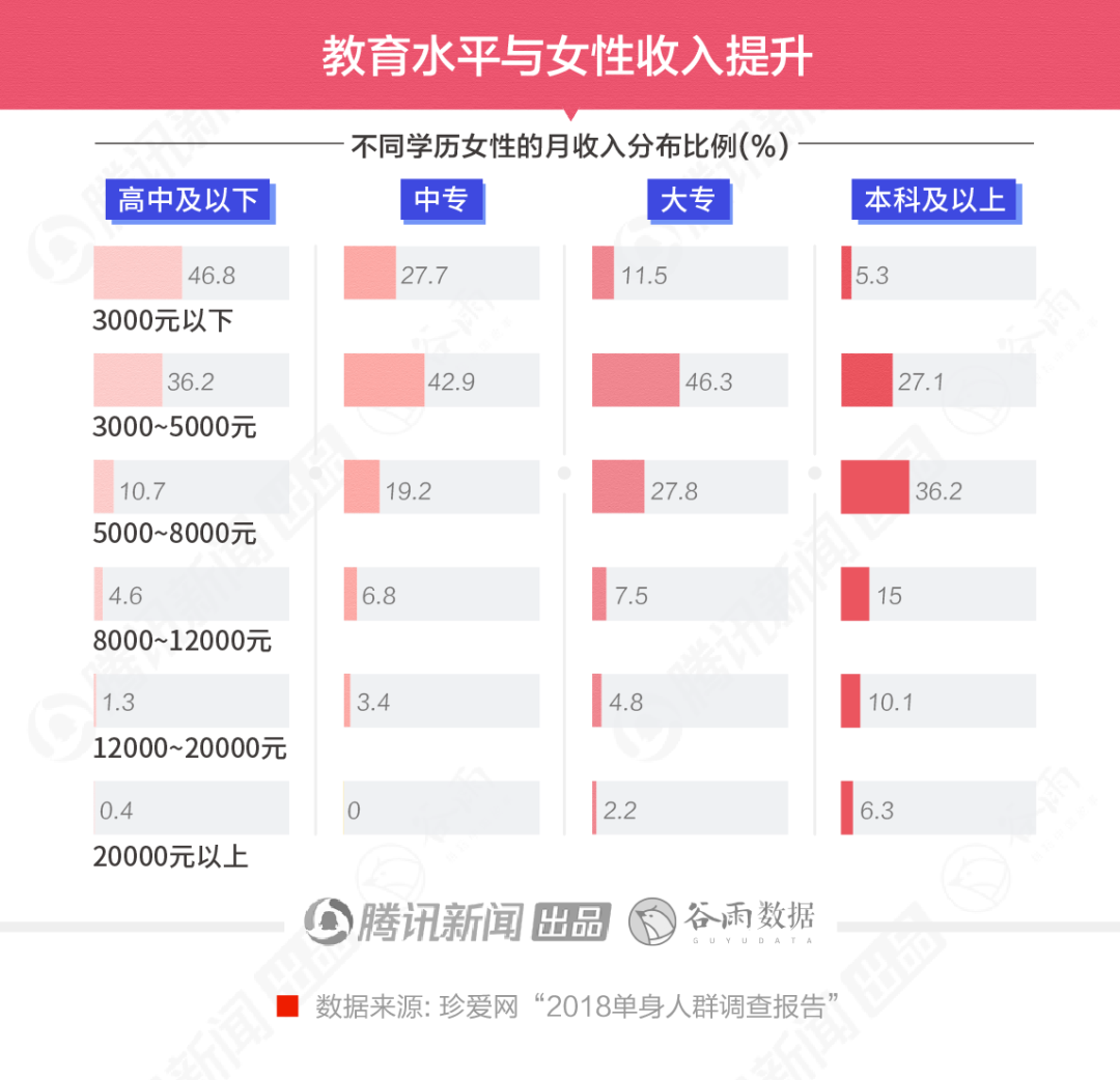 利用珍爱网在2018年开展的调研数据,谷雨数据发现当女性学历越高,其收入也会倾向在更高的区间分布。比如,在收入高于8000这一标准下,本科及以上女性达标的比例为31.4%,接近三分之一。而高中及以下女性收入在此之上的仅有6.3%。