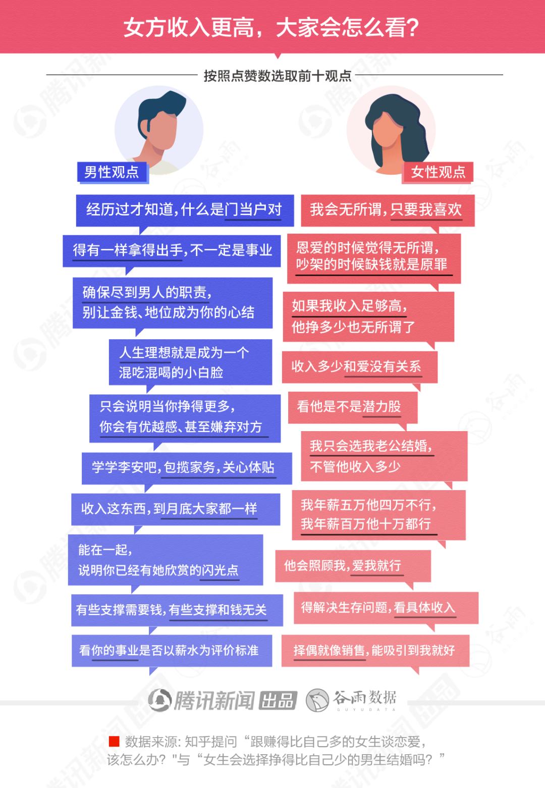 谷雨数据找到了知乎上的两个热门提问“跟赚得比自己多的女生谈恋爱,该怎么办?"以及“女生会选择挣得比自己少的男生结婚吗?”,选取点赞数前十的回答并提炼他们的核心观点。