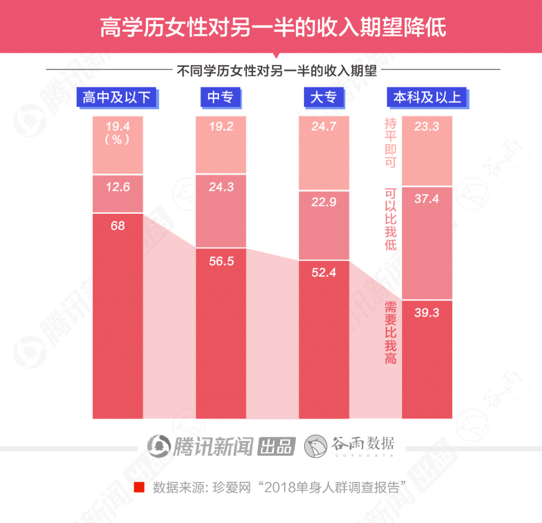 据珍爱网2018年的调研,学历越高,女性对另一半的收入期望会趋于降低。