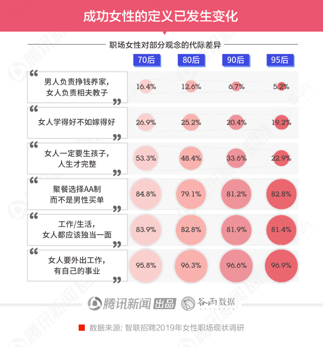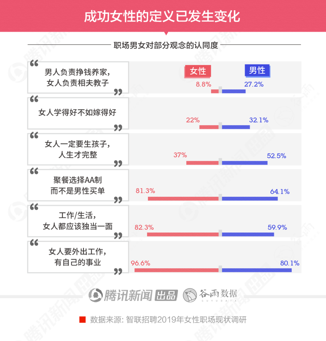 据智联招聘2019年的调研,针对“成功女性”的定义职场男女观点差异较大。比如仅有8.8%的女性认同“男人负责挣钱养家,女人负责相夫教子”,占比不足一成。过半男性认同“女人一定要生孩子,人生才完整”,但支持这句话的女性仅有37%。