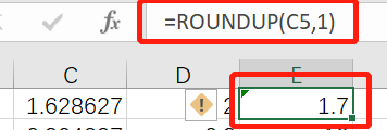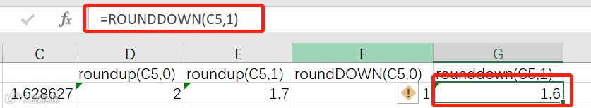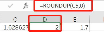 Roundup函数是向上舍入数字,如对C5向上取整roundup(C5,0),0就是取小数点后0位,也就是取整,向上舍入的意思是,对于大于5的数按照正常的四舍五入的规则要加1,对于要舍去的数小于4也要进数加1,如下例roundup(C5,1)取小数点后1位小数,按照四舍五入的做法应该等于1.6,但用roundup向上舍入的原则加1,变成1.7.