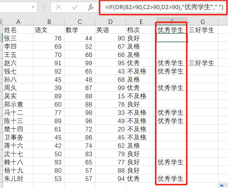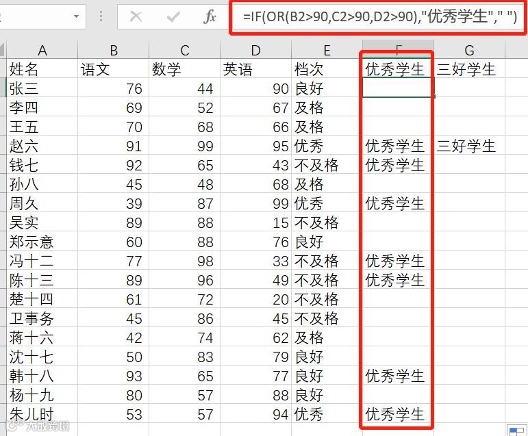 IF(OR(B2>90,C2>90,D2>90),"优秀学生"," ")