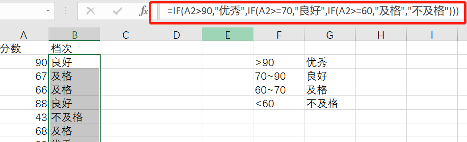 IF(A1>90,”优秀”,IF(A2>=70,”良好”,IF(A2>=60,”及格”,”不及格”))),注意双引号为英文模式下的。