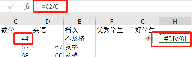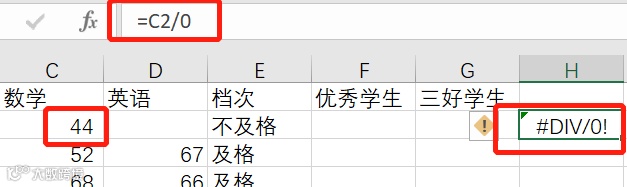 上面的例子不明显,我们来看下面这个例子,H2显示的#DIV/0!这个错误值表示分母为0,在数学上分母为0是没有意义的,所以会出现这个错误值。