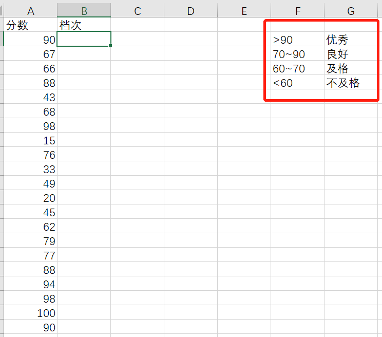 实例:A列是分数栏,我们想要通过分数来划分成优秀、良好、及格、不及格四个档次,用嵌套函数来完成。顺便提一句,这是将连续型变量转换为分类变量。