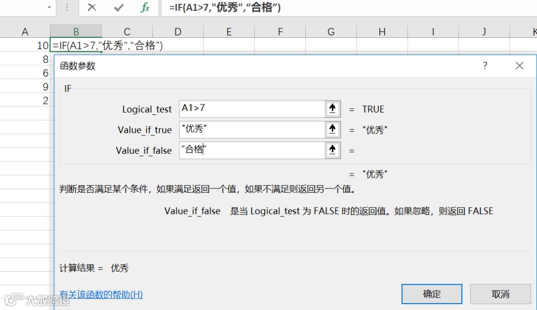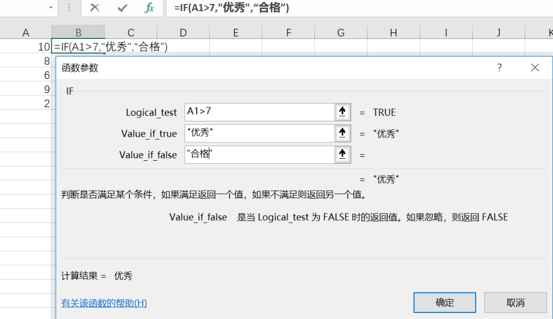 实例:对A列中大于7的值显示为优秀,小于等于7的值显示为合格。用if(A1>7,”优秀”,”合格”),注意,excel里字符串要用双引号,之前也提到过。