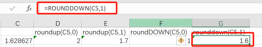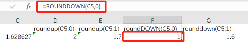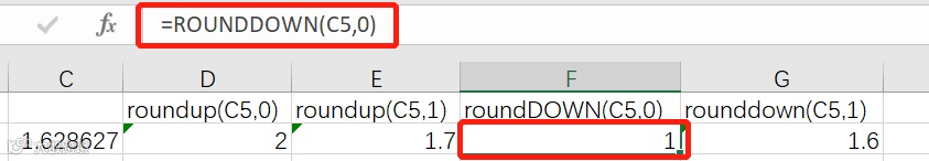 和roundup函数相反,rounddown函数是向下舍入。向下舍入的意思是对于小于4的数按照四舍五入的规则正常舍去,对于要舍去的数大于5也要舍去。如下例rounddown(C5,0),对C5向下取整,按照正常的四舍五入应该为2,但rounddown取整后为1。