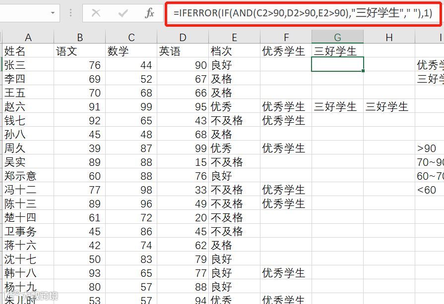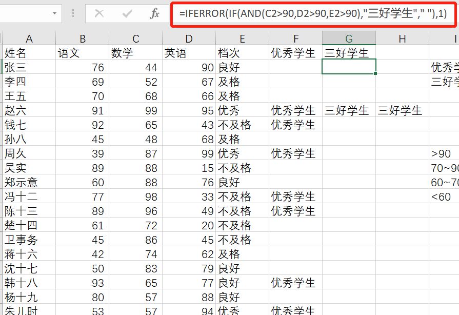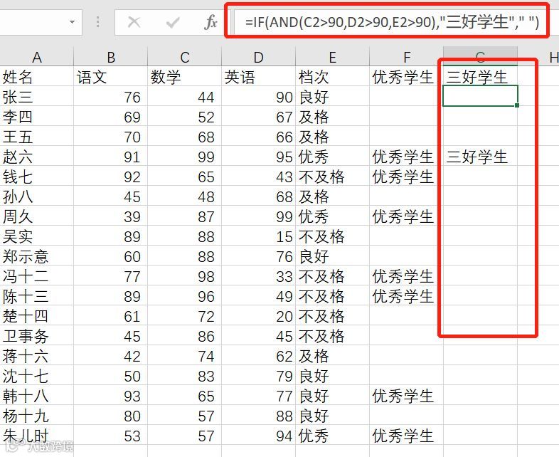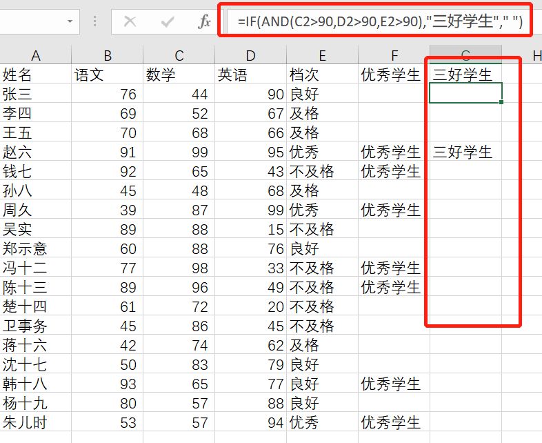 IF(AND(C2>90,D2>90,E2>90),"三好学生"," ")