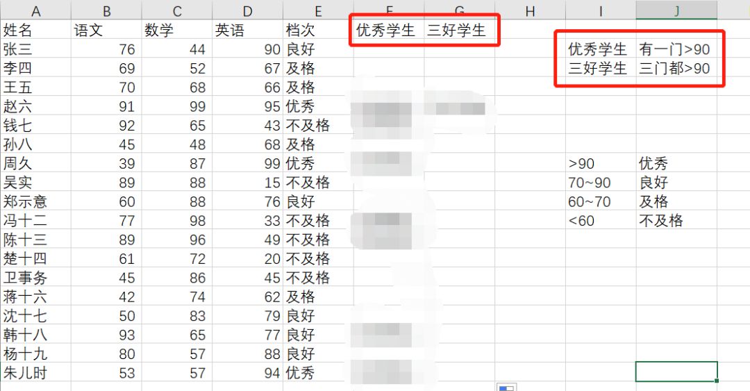 实例:选优秀学生和三好学生,语文数学英语有一门科目的成绩大于90则判断该生为优秀学生,三门科目成绩全部大于90为三好学生。
