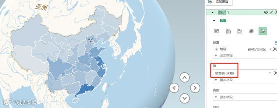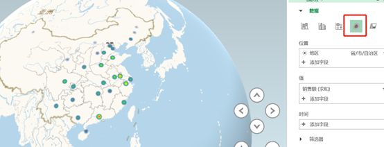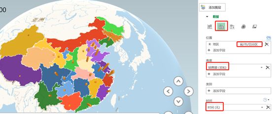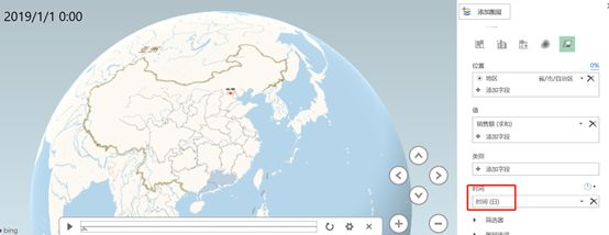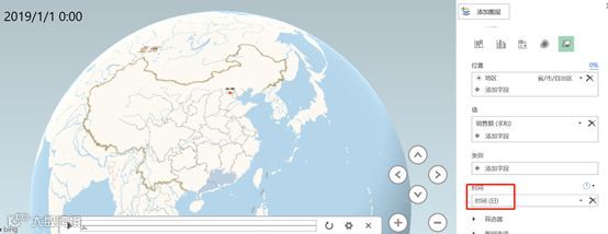 以上是静止的数据地图,但我们的数据里是有时间字段的呀,这个时间字段放哪里呢?我们可以看到刚好有一个【时间】选项卡,我们把时间添加进去试试看。还是以【区域】-【销售额求和】为例,把时间添加进去以后发现左边图中出现了一个时间滚动条,我们点开来看一下。