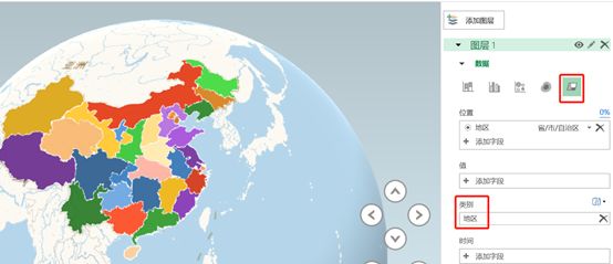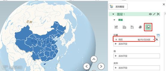 将地区字段放入图层1的【位置】选项卡中,并将识别方式选为“省/市/自治区”,将可视化的类型改为“区域”,power map会自动识别地理位置。可视化的方式有5种,堆积柱形图、簇状柱形图、气泡图、热度地图和区域。