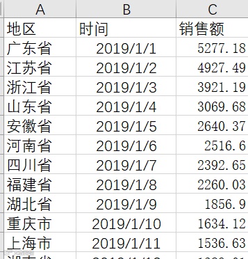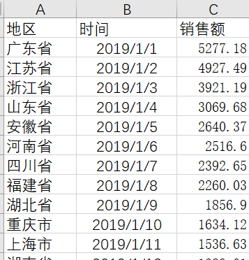 做数据地图最少有两个字段,地址和值。地址的数据可以是经纬度、国家名称、城市和省/市等,值是相应地址对应的数值,可扩展地,还可以有时间数据,时间数据的格式一定是日期格式。以下图数据为例,包含了地址、时间和销售额三个字段。