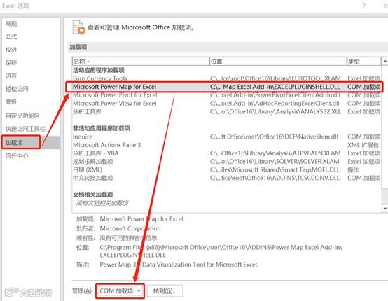 2、 有这个功能但点不了。需要手动设置一下,请点击【文件】——【选项】——【加载项】,找到Microsoft Power Map for Excel,在左下角的管理处选择com加载项,然后点【转到】。