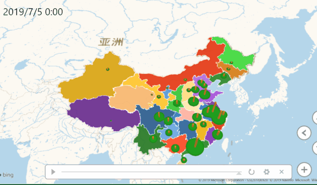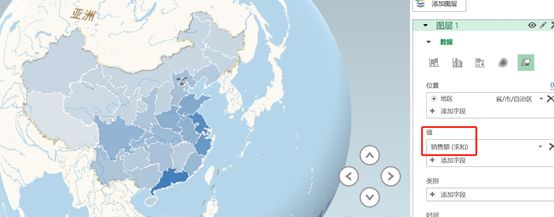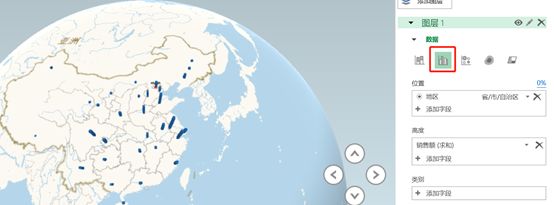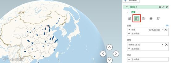 添加一个图层2,在图层2中同样的【位置】选择省市自治区,【高度】选择销售额求和,【时间】选择时间,可视化更改为簇状柱形图。可以看到在底层上多了柱状图。