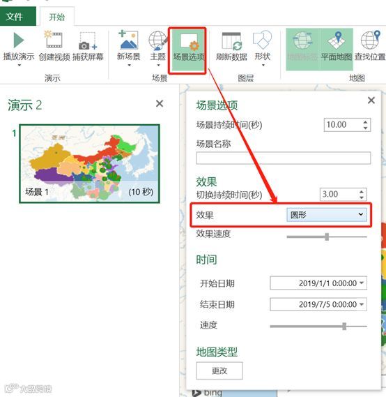 整个数据地图是可以作为视频文件输出的,而场景选项卡是可以定义动画效果,类似PPT中的动画。在【场景选项】的【效果】里,可以选择圆形、滑动、飞入等效果。就还以刚才花花绿绿的图层进行演示吧,将效果选择为“旋转地球”。