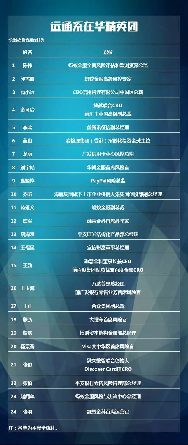 类似的名单很长:金可冶,运通亚太区首席风控官。赵闻飙,运通副总裁。李鸿,运通全球网络服务亚太区风险总监。王玉海,运通国际部风险政策总监……