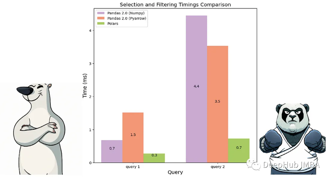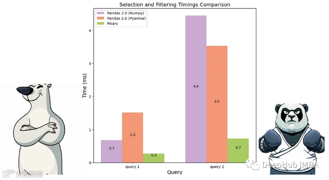 在性能方面,Polars的数值filter速度要快2-5倍,而Pandas需要编写的代码更少。Pandas在处理字符串(分类特征)时速度较慢,这个我们在以前的文章中已经提到过,并且使用df.query函数在语法上更简洁,并且在大数据量的情况下会更快,这个如果有人有兴趣,我们再单独总结。