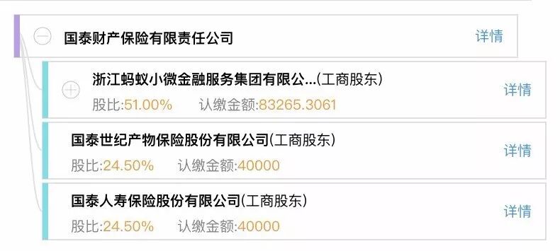 △ 天眼查数据显示,蚂蚁金服是国泰产险的最大股东,占股51%