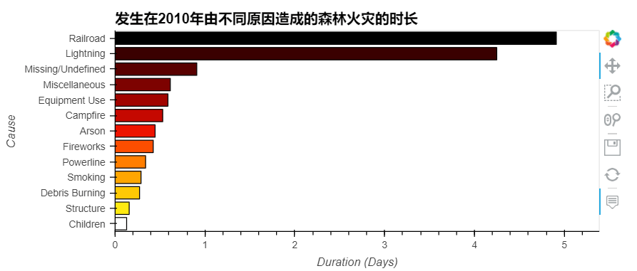 当然我们也可以绘制将柱状图绘制成是水平方向的,例如我们想要探究一下不同原因造成的火灾的持续的时间有多长,代码如下