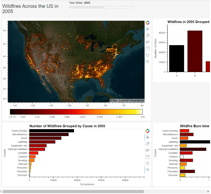 df = pd.read_sql_query("SELECT LATITUDE, LONGITUDE, STAT_CAUSE_DESCR, FIRE_SIZE, FIRE_SIZE_CLASS, DISCOVERY_DATE, CONT_DATE, STATE, FIRE_YEAR FROM fires", conn)