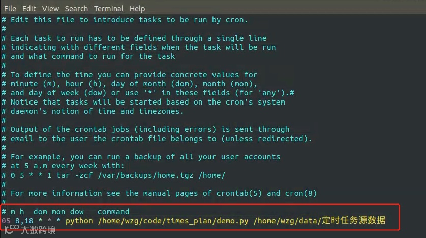 打开crontab,编辑如下内容到最后一行,保存并退出