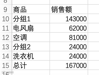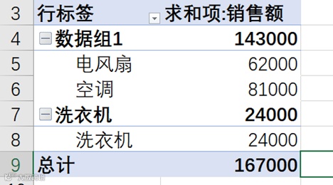在Excel中还支持对数据透视表中的数据进行分组,例如可以把风扇和空调的数据分为一组来计算,如图14所示。