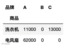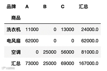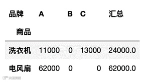 品牌A 11000.0B 0.0C 13000.0汇总 24000.0Name: 洗衣机, dtype: float64