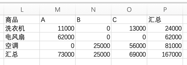 pt3 = df.pivot_table(index='商品', columns='品牌', values='销售额', fill_value=0, aggfunc='sum', margins=True, margins_name="汇总")sheet.range("L1").options(index=True, header=True).value = pt3