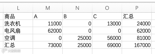 商品洗衣机 24000.0电风扇 62000.0空调 81000.0汇总 167000.0Name: 汇总, dtype: float64