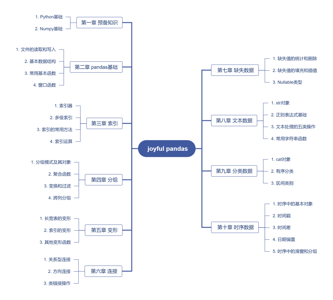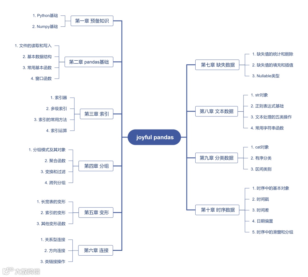 教程梳理了pandas中常用的函数,将函数之间的逻辑关系总结为“基础知识+4类操作+4类数据”的模块结构,展示了数据处理的宏观体系,并针对数据分析中“怎么分析”“怎么处理”“怎么加速”3个核心问题给出解决方案。