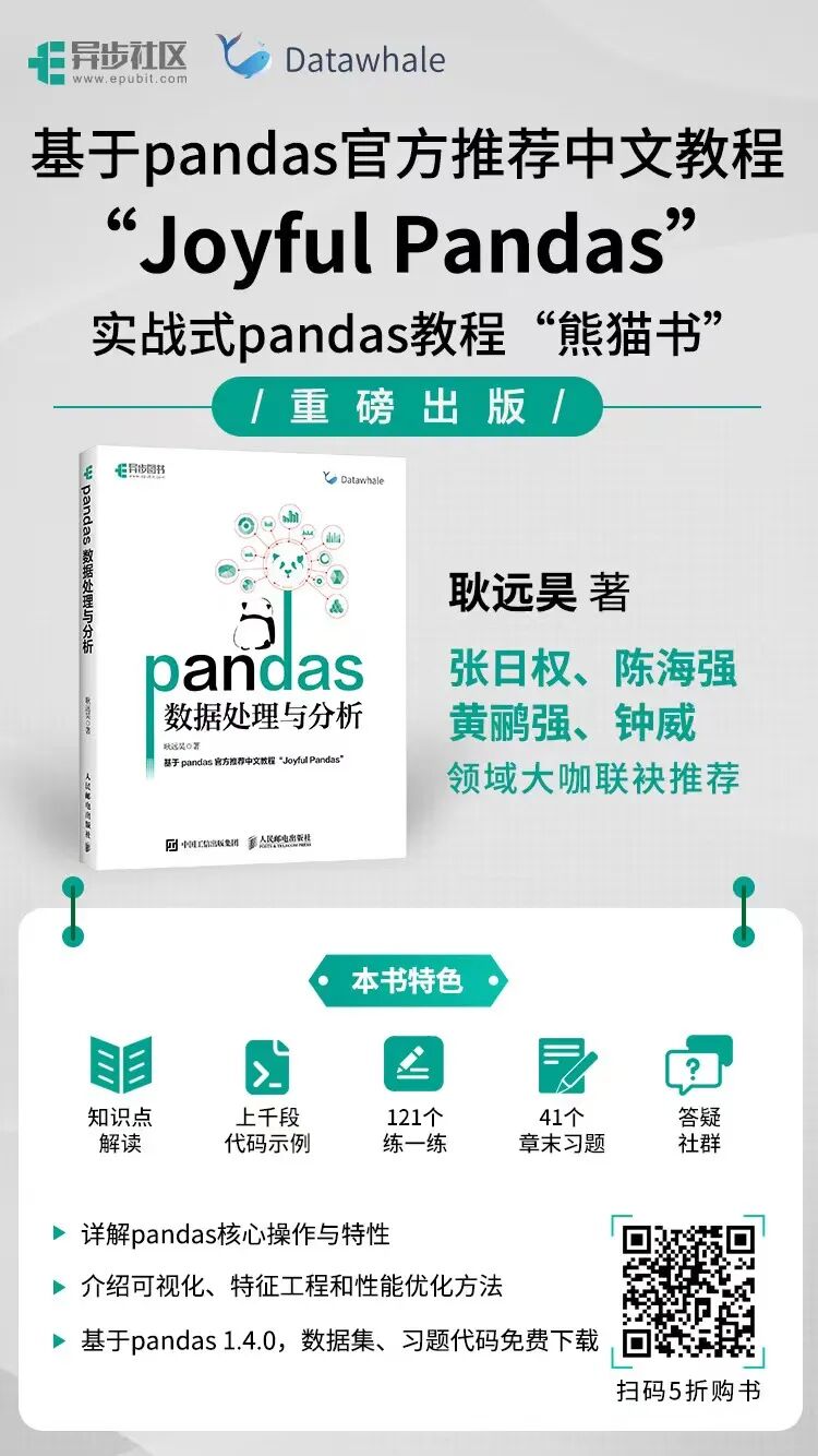 最后,为了感谢各位读者的一直以来的支持,在Datawhale送出5本《pandas数据处理与分析》,依然是老规矩:评论区留言并点赞数前五的读者将直接送书。