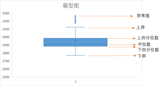 同样,四分位数也是对数值型数据集中趋势的度量,后面的度量都适用于数值型数据。四分位数就是将数据排序后四等分,处于25%(下四分位数)和75%(上四分位数)位置上的值即四分位数,箱型图可以很好地用来描述四分位数。