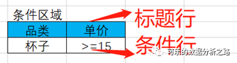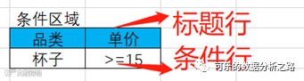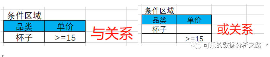一个标题行对应一个条件行,表示一个条件,若要表示多个条件需要多行或多列,如下图左“品类”、“单价”两个标题行对应了两个条件,这两个条件行在同一行,表示与的关系,意思是筛选“品类”为“杯子”,并且“单价”大于等于15的值。下图右条件行不在同一行,表示或的关系,意思是筛选“品类”为“杯子”或者“单价”大于等于15的值。