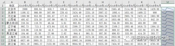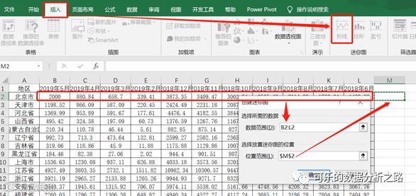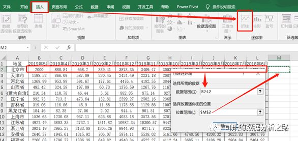迷你图可以展示数据的趋势,在不制作图表的前提下观测出数据的大致走向。如下图是全国各省经济数据,对北京市制作随时间变化的迷你图,观察大致趋势。点击【插入】——迷你图区域中的【折线】,在弹出的【创建迷你图】对话框中,数据范围选择B2:L2,迷你图位置放置在M2单元格。