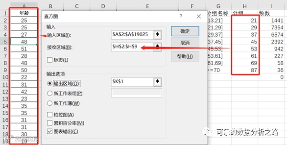 Step2:在弹出的【直方图】对话框中,输入区域是数据源一列,接收区域是提前分组的区域,$H$2:$H$9,输出区域选择K1单元格,勾选图表输出。
