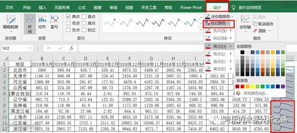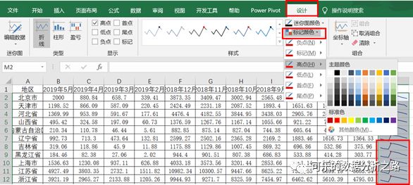 点击【设计】——【标记颜色】,对【高点】标记为红色,则出现最高点显示为红色的效果。