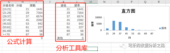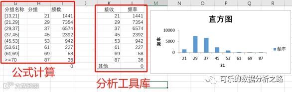 Step3:点击【确定】按钮,得到分组和频率以及图表输出的结果。可以看出来频数和我们用公式计算得到的结果是一致的。对于得到的图表可以再进一步美化加工一下。