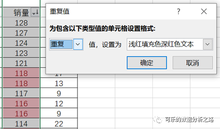 突出显示某一列数据中重复的值是应用较多的规则。如图对销量一列数值相同的单元格突出显示,点击【开始】——【条件格式】——【突出显示单元格规则】——【重复值】,在弹出的【重复值】对话框中,设置重复的单元格填充浅红,字体为深红颜色,这样,就得到图示的条件格式效果。