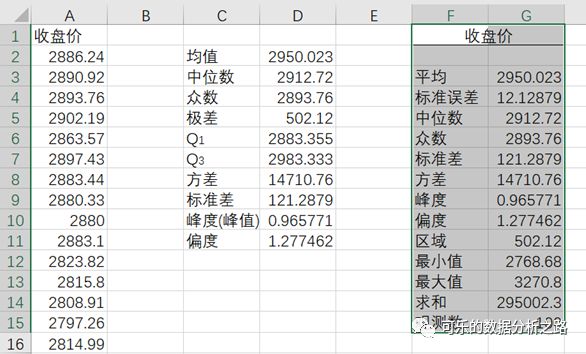 我们要是想要知道一个数据集的均值、方差、极值等描述统计数据,是要自己一个公式一个公式去敲吗?这也太麻烦了,描述统计这个工具,可以直接生成所有的数据。