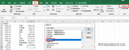 Step1:点击【数据】——【数据分析】菜单,在弹出的【数据分析】对话框中,选择【描述统计】。
