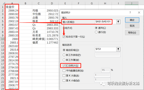 Step2:在弹出的【描述统计】对话框中,输入区域选择A1:A101整个数据集所在的区域,如果选到了标题行,则勾选下方的标志位于第一行;输出区域可以自行指定;至少勾选上汇总统计一个功能,其余的平均数置信度、第K大值、第K小值看情况勾选。