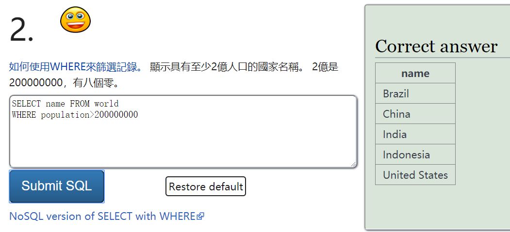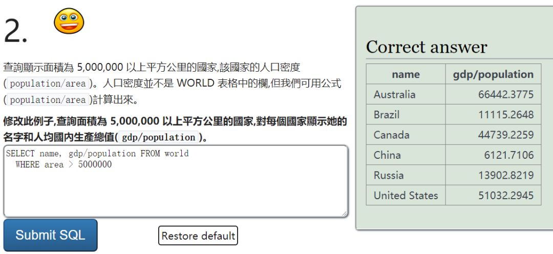 SQL是一种关系型数据库的结构化查询语言,常用的关系型数据库由MySQL,SQL Server,Oracle等,可以直接下载MySql数据库客户端,或者也可以用SQLZoo来练习,这是一个网页版的题库,个人感觉对于新手小白来说SQLZoo比安装那些数据库客户端要友好的多,可以在线进行练习,毕竟我们不是奔着程序员的方向去的,而且你还得自己创建各种表,费时费力。