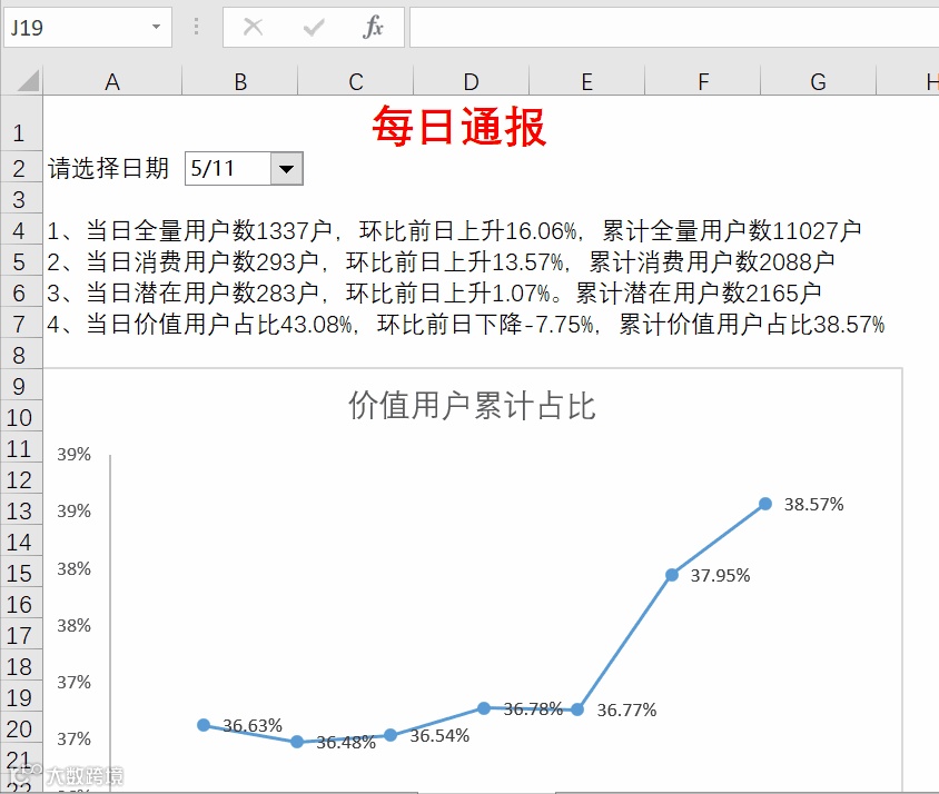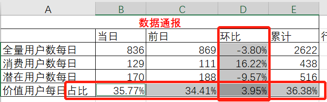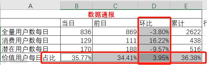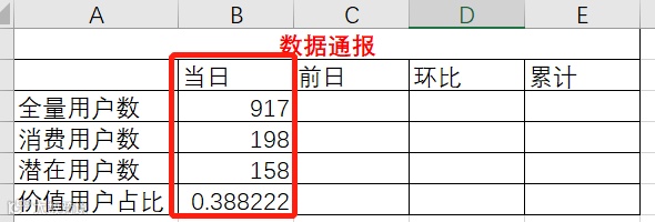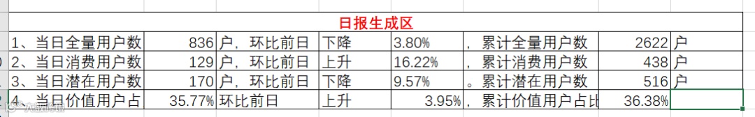 事情是这样的,小明每天都要进行日报通报,统计每天的全量用户数、消费用户数以及潜在用户数,算出价值用户数占比,且每个数都要与前一日对比,输出一大串文字并生成图片。每天的内容都是一样的,只是数字不一样,之前小明是每天都算出这些数字,然后再从日报中更改相应的部分,这样的工作重复个一两年也是会把人的精气神熬没了的呀。小明问我为什么他学了那么多公式,却依旧用不好Excel?