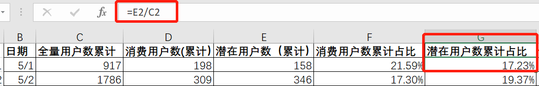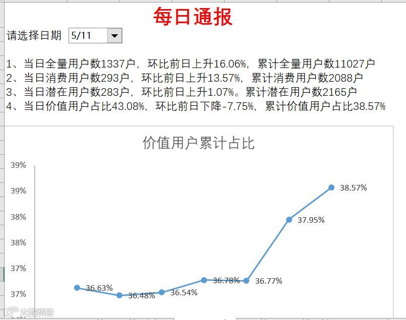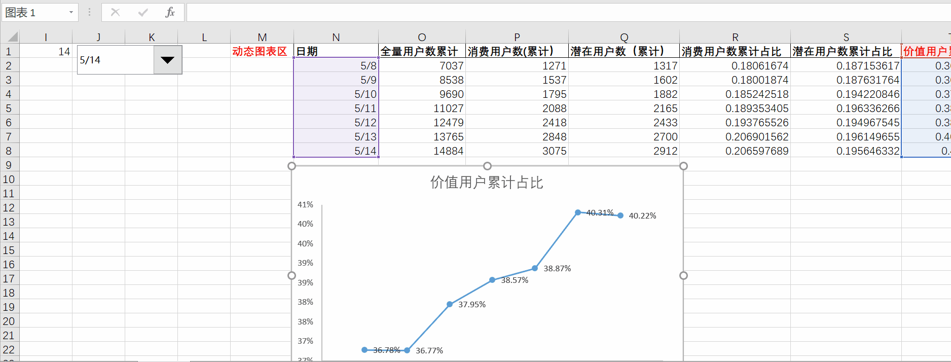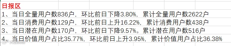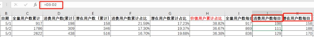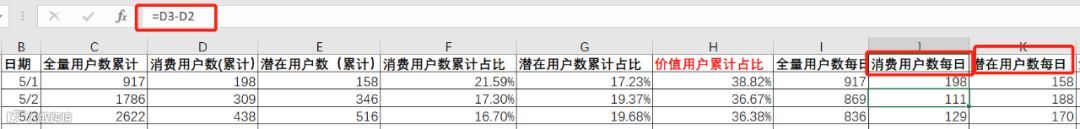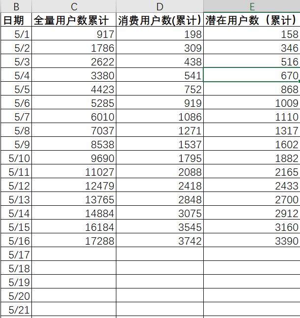 原始数据是这样的:日期、全量用户数累计、消费用户数(累计)、潜在用户数(累计)