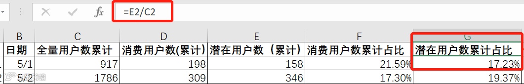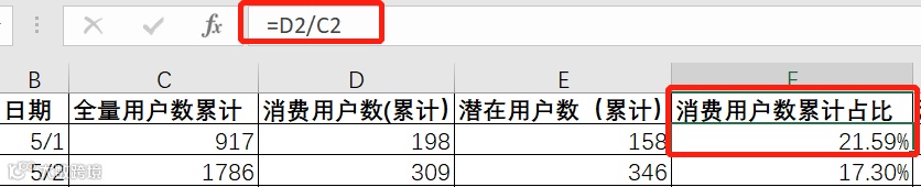 首先我要算出消费用户数的累计占比,用累计消费用户数除以累计全量用户数得到。